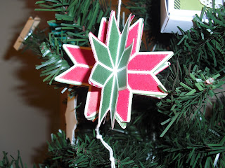To make this ornament, I cut using the framelit 4 green designs and 4 red designs. I then alternated gluing them together.